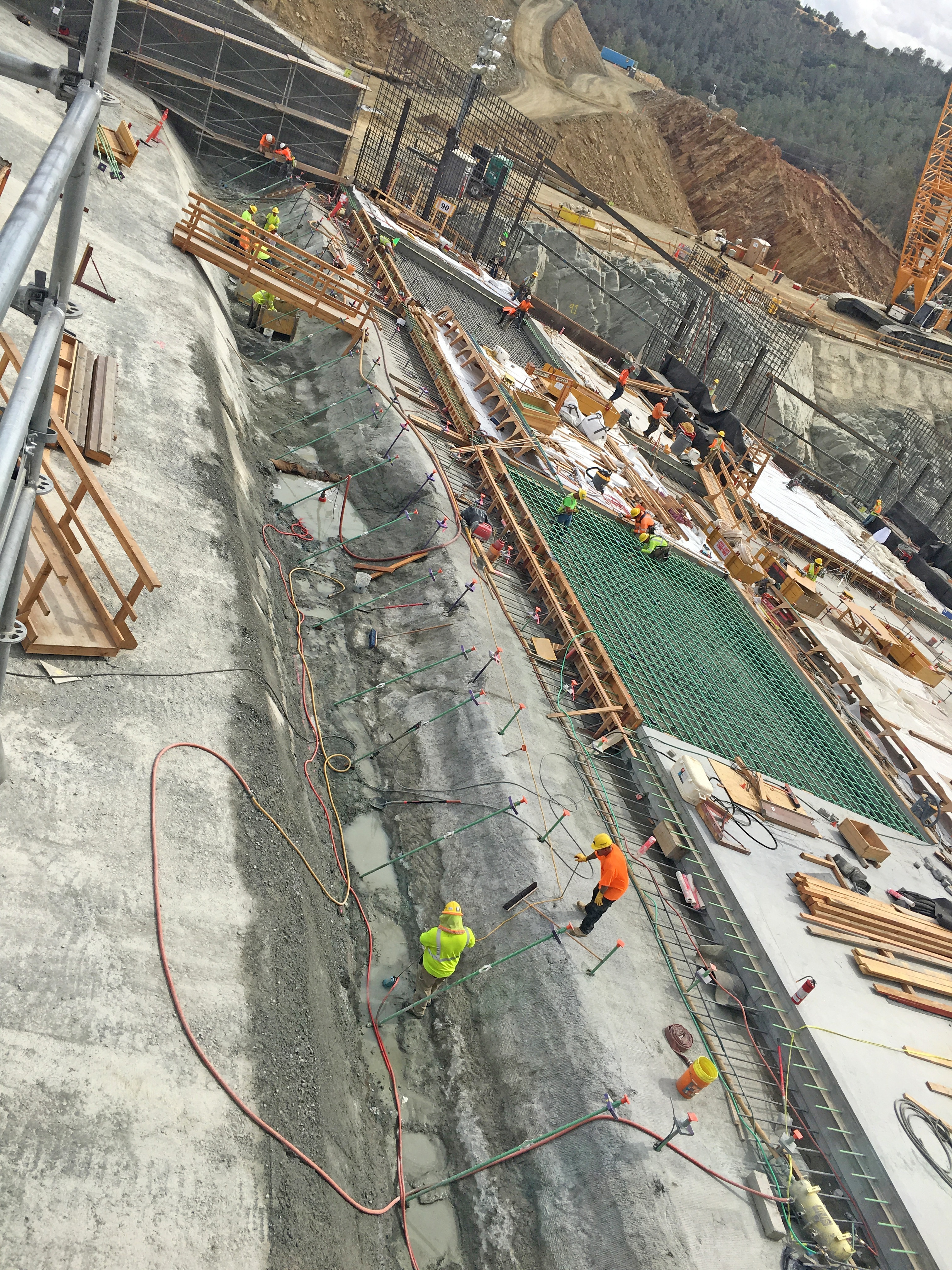 Within the scope of the second phase, new drainage systems were placed and more than 213m (700ft) of the upper chute was replaced with a steel-reinforced structural concrete chute. In addition, a 0.76m (2.5ft) thick steel-reinforced structural concrete slab will be placed over the roller-compacted concrete that was constructed in the middle chute during phase 1. The slab in the chute was anchored down with 36mm Ø DYWIDAG THREADBAR® Anchors (#11 GR75) similar to what was done in the first phase. The temporary concrete walls in the middle chute were replaced by higher structural concrete walls.