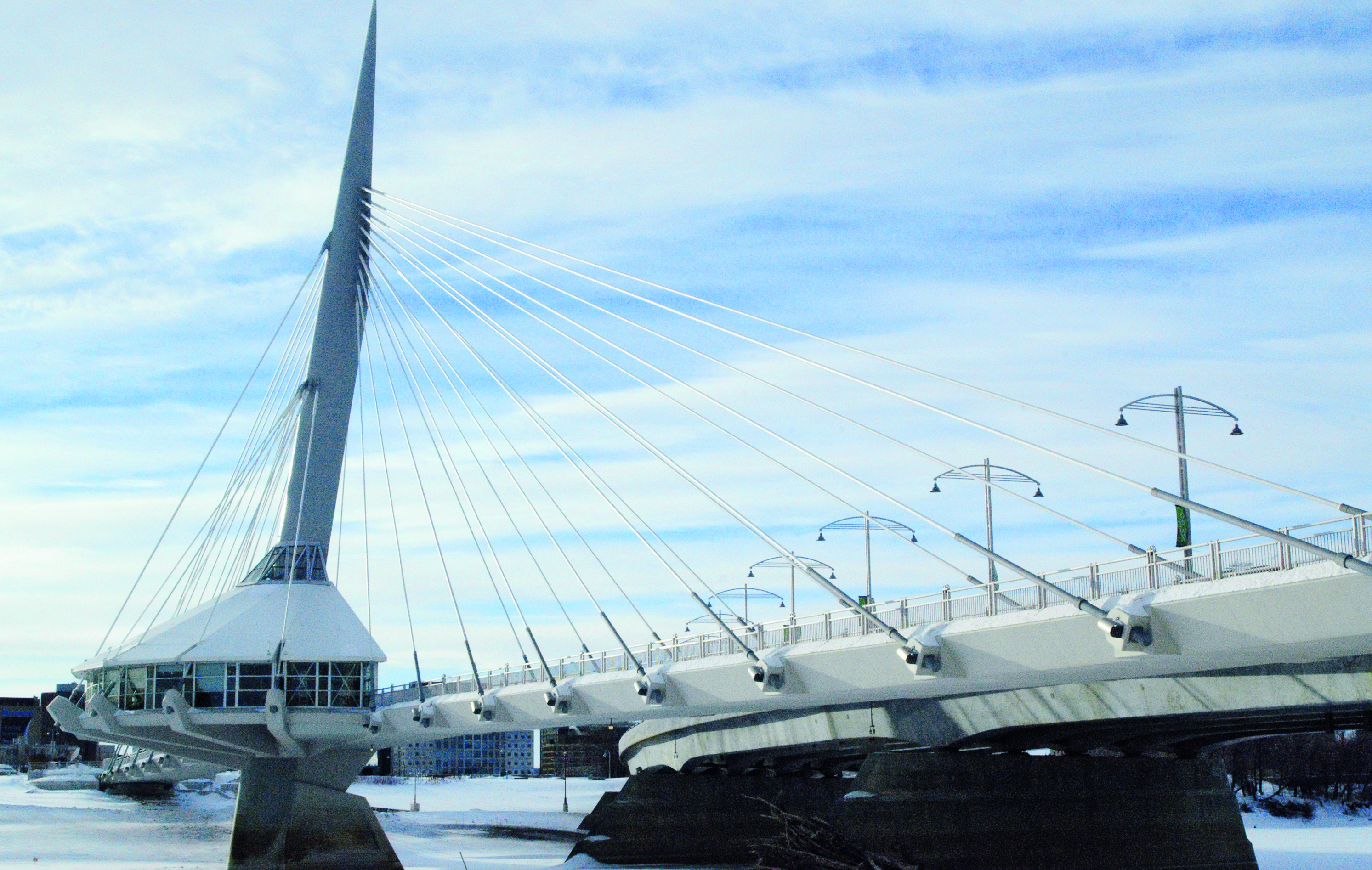 This led to the construction of two bridges - the Provencher Paired Bridges: A four-lane bridge for cars and trucks and a smaller, more elegant bridge to be exclusively used by pedestrians, cyclists and recreational users. Some of the unique features of the pedestrian bridge, the Esplanade Riel, include an architectural composite tower that is prestressed with a cantilevered and stayed semi-circular plaza area at the base of the tower, which provides space for commercial activities and also accommodates a restaurant. This "annex" to a bridge is absolutely new for bridges in North America.