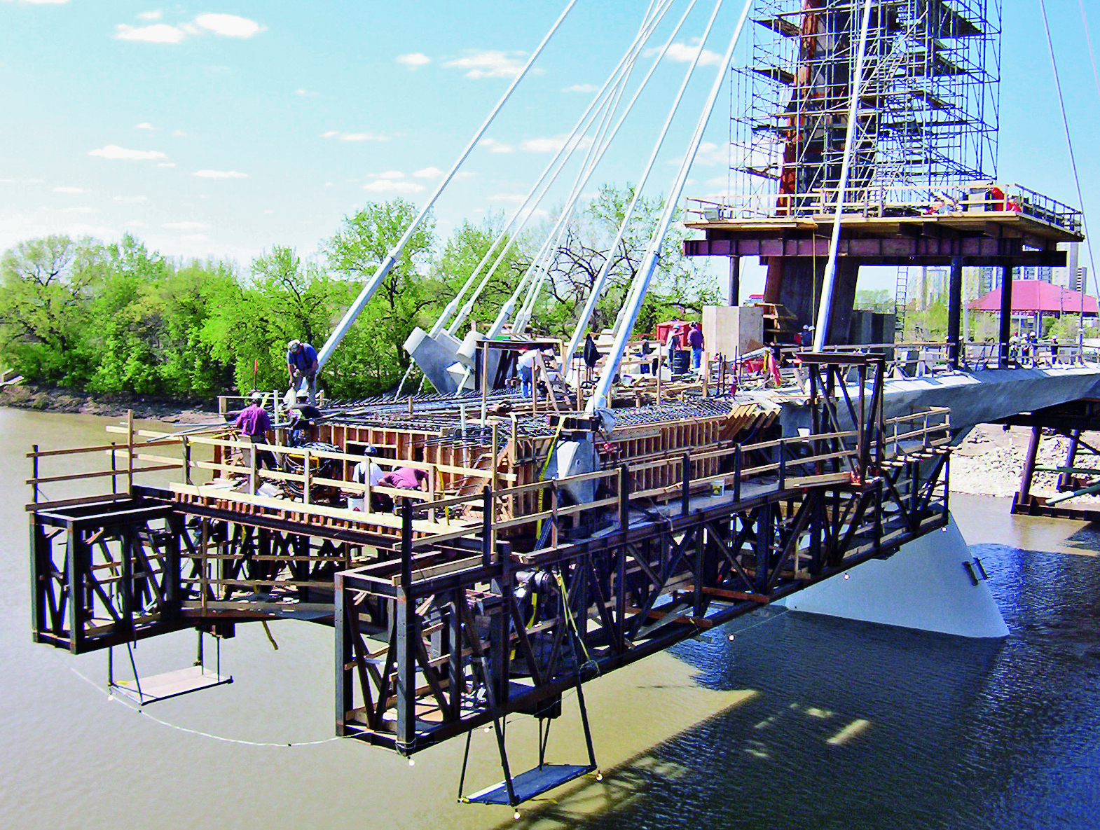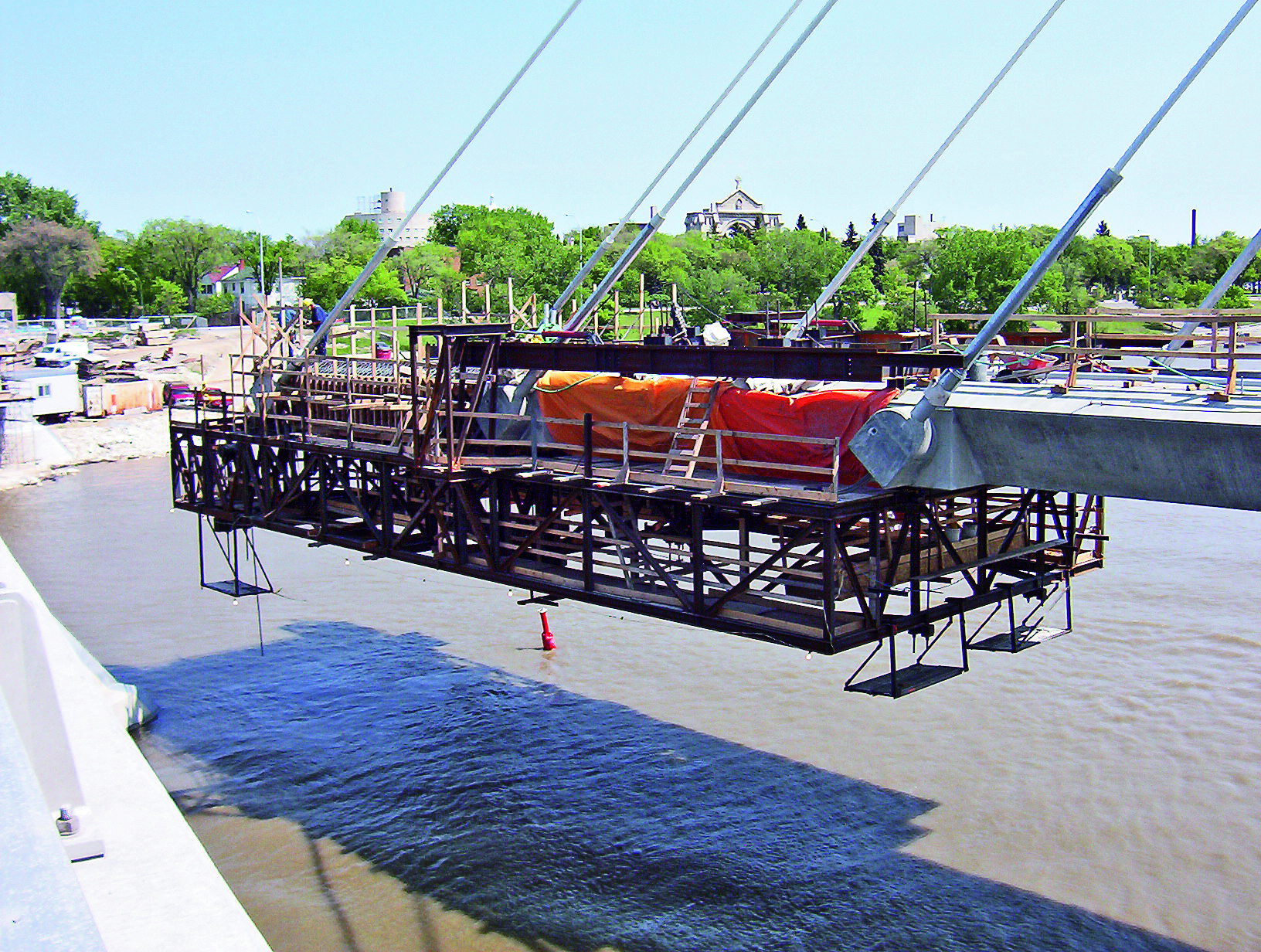 Precast reinforced concrete elements were used for anchoring the stay cables in the bridge deck; thus eliminating the need to adjust the formwork and the form traveller to the varying angles of the cables. These alternatives were decisive for the awarding of the contract and saved the city of Winnipeg CAN$2.0 million over the originally planned bridge option designed to be built using precast elements. The stay cables were spaced 10 m apart. This spacing makes it possible to replace individual cables without the need to install falsework. For additional reinforcement the super structure of the entire bridge was also internally post-tensioned in the longitudinal direction using DYWIDAG Tendons supplied and installed by DYWIDAG.