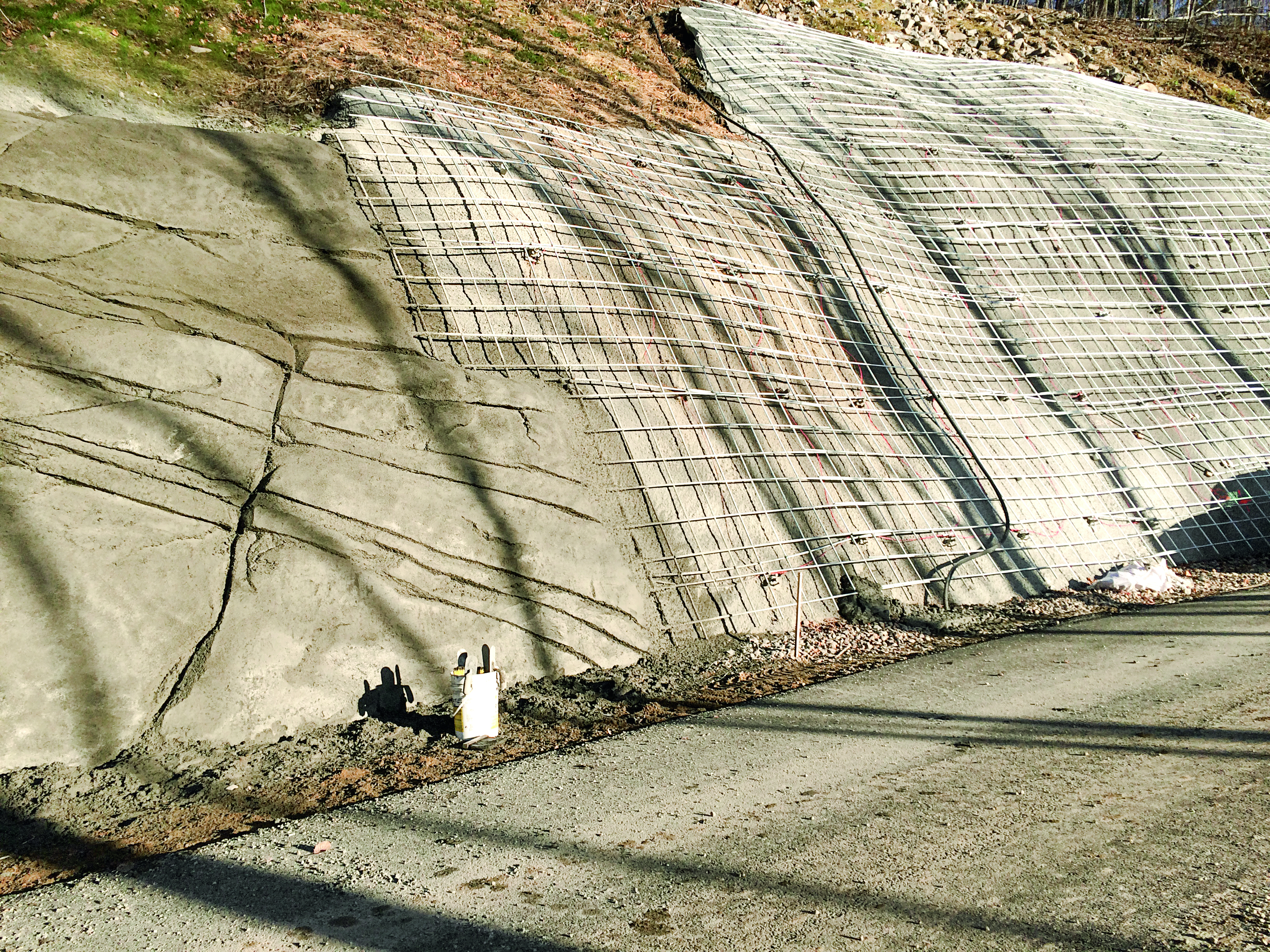 All hardware was galvanized for long-term corrosion resistance. Following soil nail installation, a permanent concrete facing was applied on top of the shotcrete retaining walls to guarantee a minimum service life of 75 years.