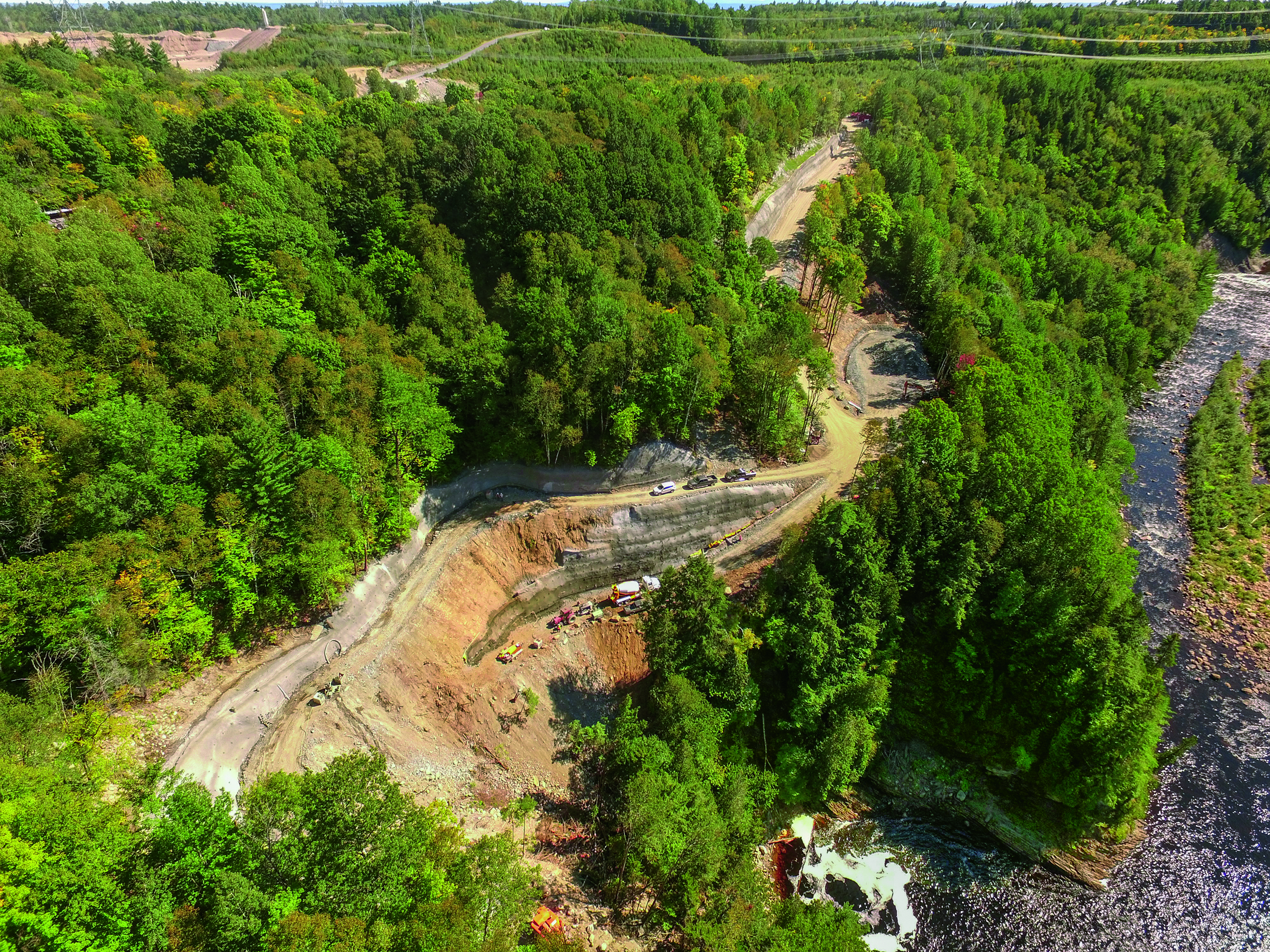 The project involved extensive slope stabilization to ensure a reliable access to the powerhouse site. Due to challenging access constraints and the need to prevent any visual impact on the popular tourist attraction of Sainte-Anne Falls, the decision was made to construct three permanent retaining walls.