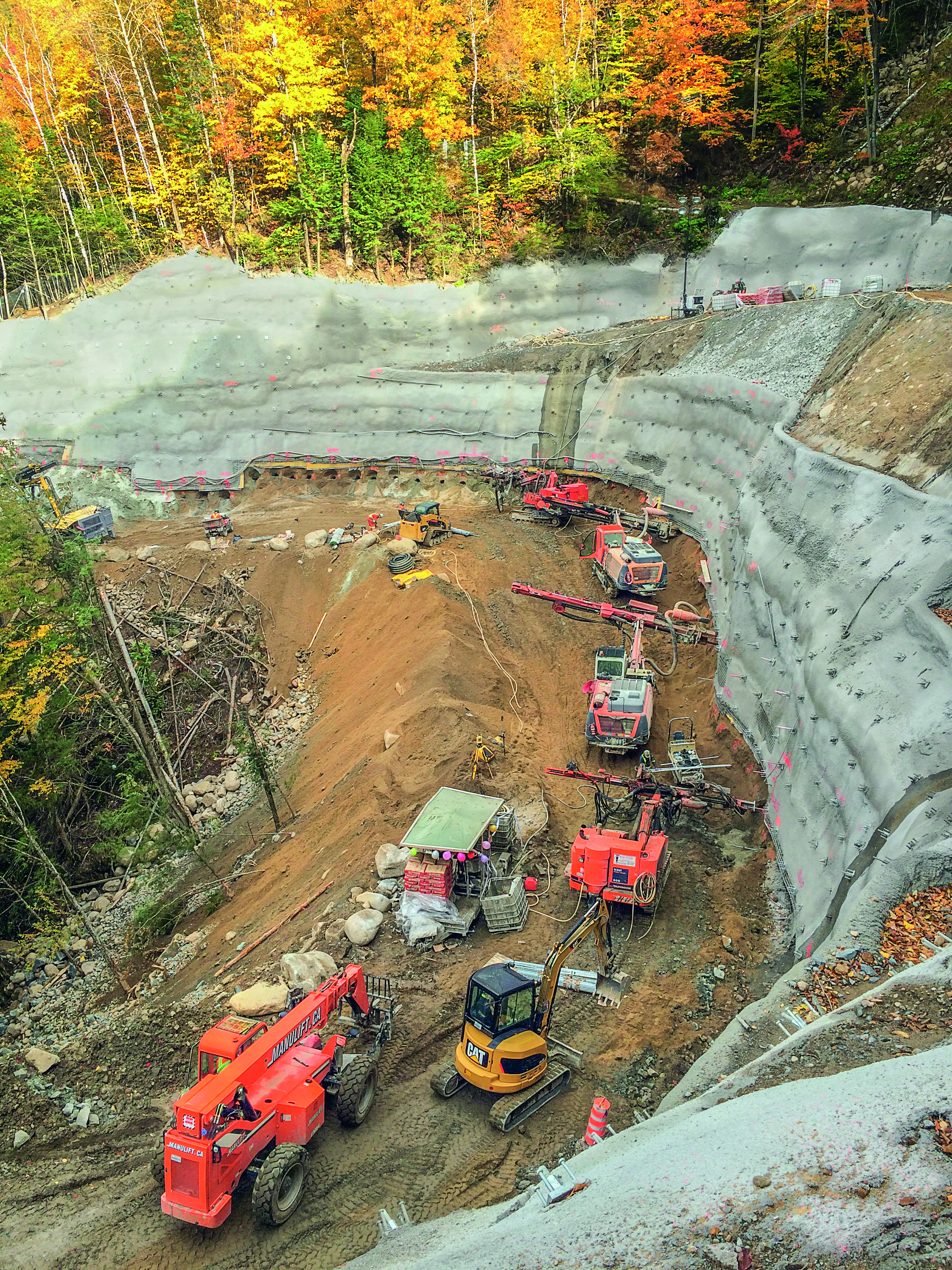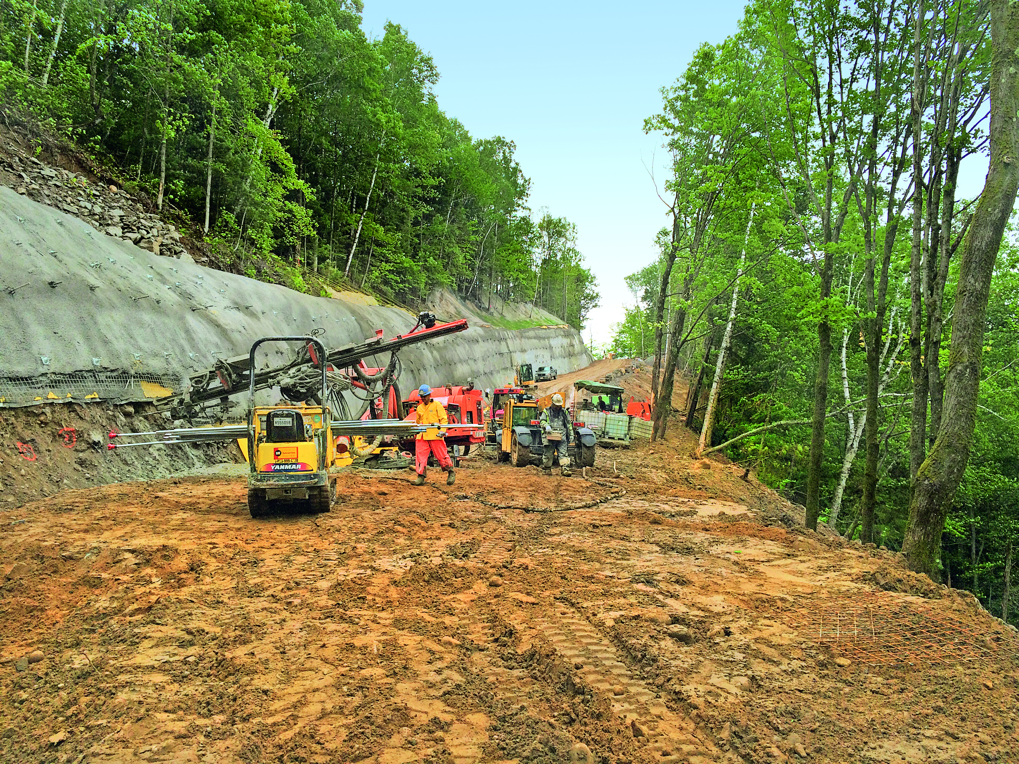 The main retaining wall crosses the Cap Tourmente fault line, where challenging ground conditions were anticipated and effectively encountered. These included very steep natural terrain slopes, extremely dense soil in the lower sections of the wall and the presence of large boulders.