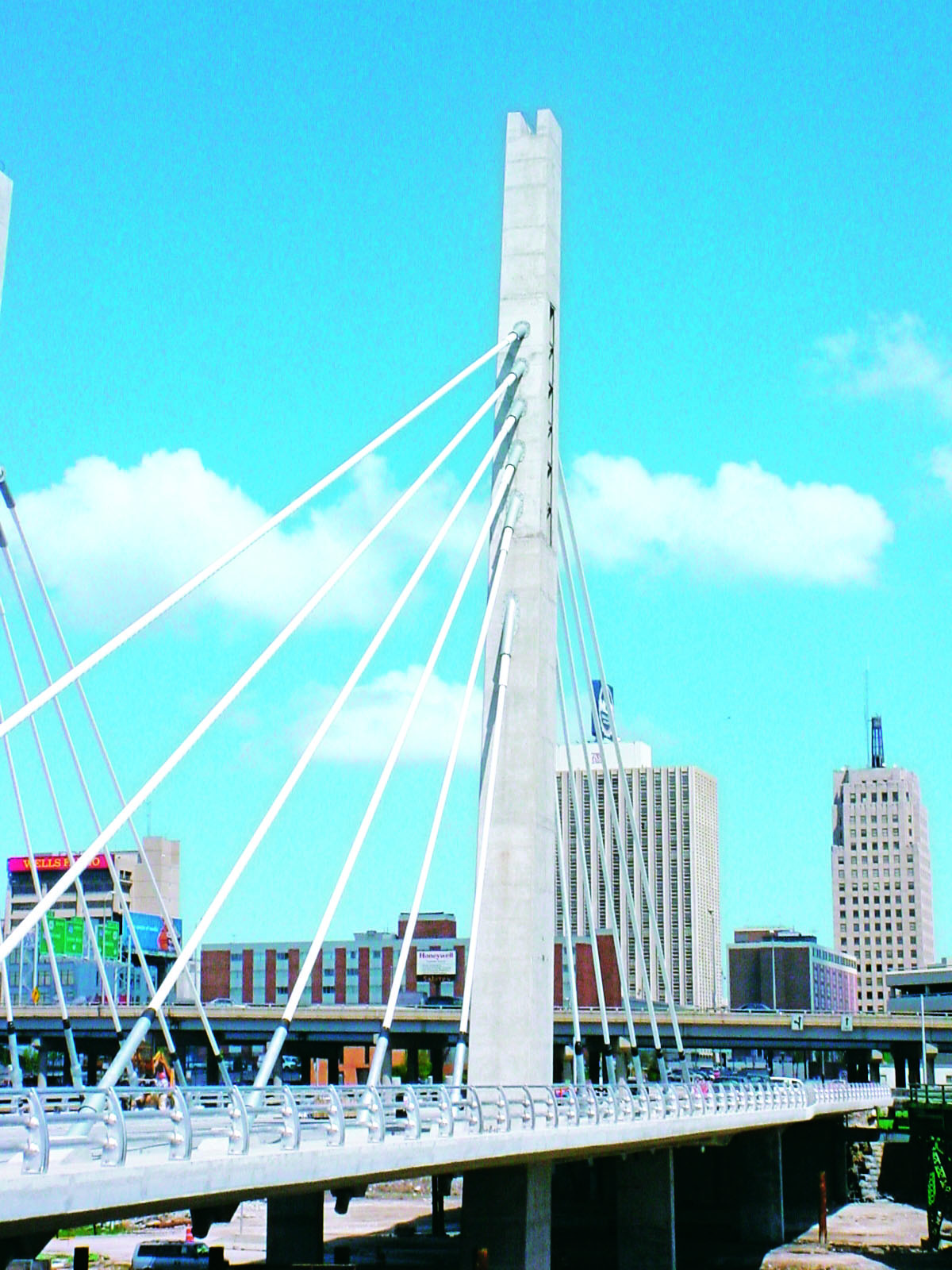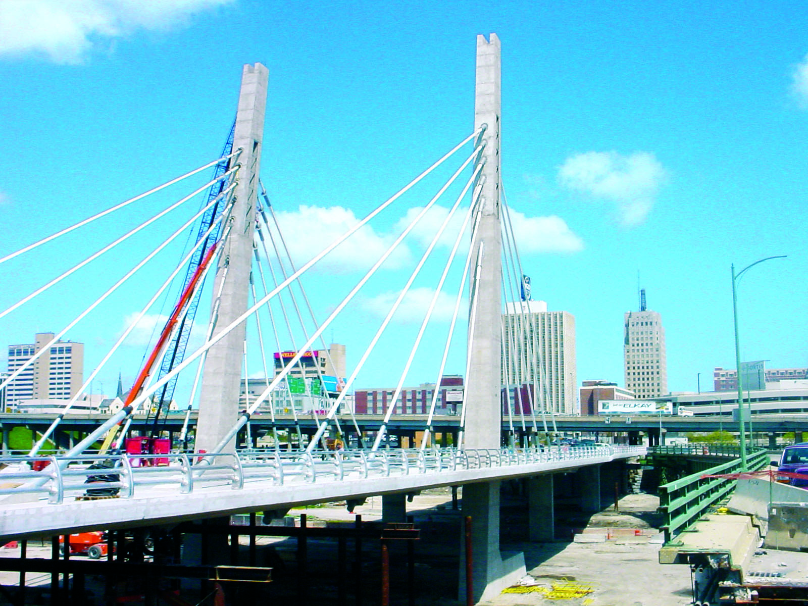 The 42.7 m high pylons, which are sloped backwards, are stark contemporary features in the old historic area of Milwaukee. The stay cables were DYWIDAG DYNA Grip® type 37-0.6" with a maximum length of 62.5 m. The strands were anchored using the DYWIDAG DYNA Grip® Stay Cable System. For the prestressing of the cables the ConTen method in combination with gradient jacks was used. The whole project was successfully completed in fall 2002.