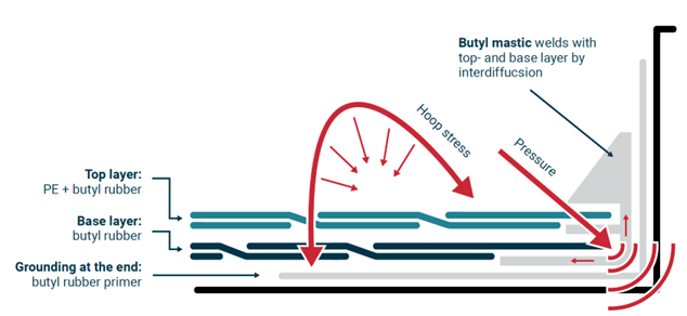 The inner layer Cableskin® base and the outer coloured layer Cableskin® top are multilayer tapes with coextruded butyl-rubber layers. Once the two layers are in contact with each other, they cold weld together by interdiffusion to form one inseparable material. Butyl rubber adapts to rough surfaces and avoids air inclusions. Furthermore, it remains ductile by its nature thus adaptable to movements and is consequently tight over the whole lifetime. Fully functional corrosion protection is provided immediately after application, and there is no need to pre-treat the surface. However, the cable's surface should be dry and preferably 3 K above dew point for application.