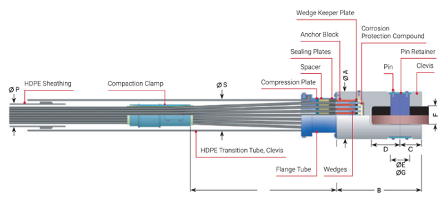 Design I: All anchorage components as an integral part of the clevis offer identical design parameter compared to the DYNA Grip® standard system and with this benefit from DYWIDAGs extensive testing history and experience.