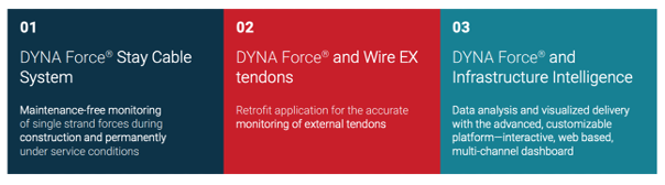 The DYNA Force® Monitoring System measures the force in steel bars and strands during construction and service life. This structural health monitoring system for cable stayed and overdosed bridges is currently used in over 85 projects worldwide