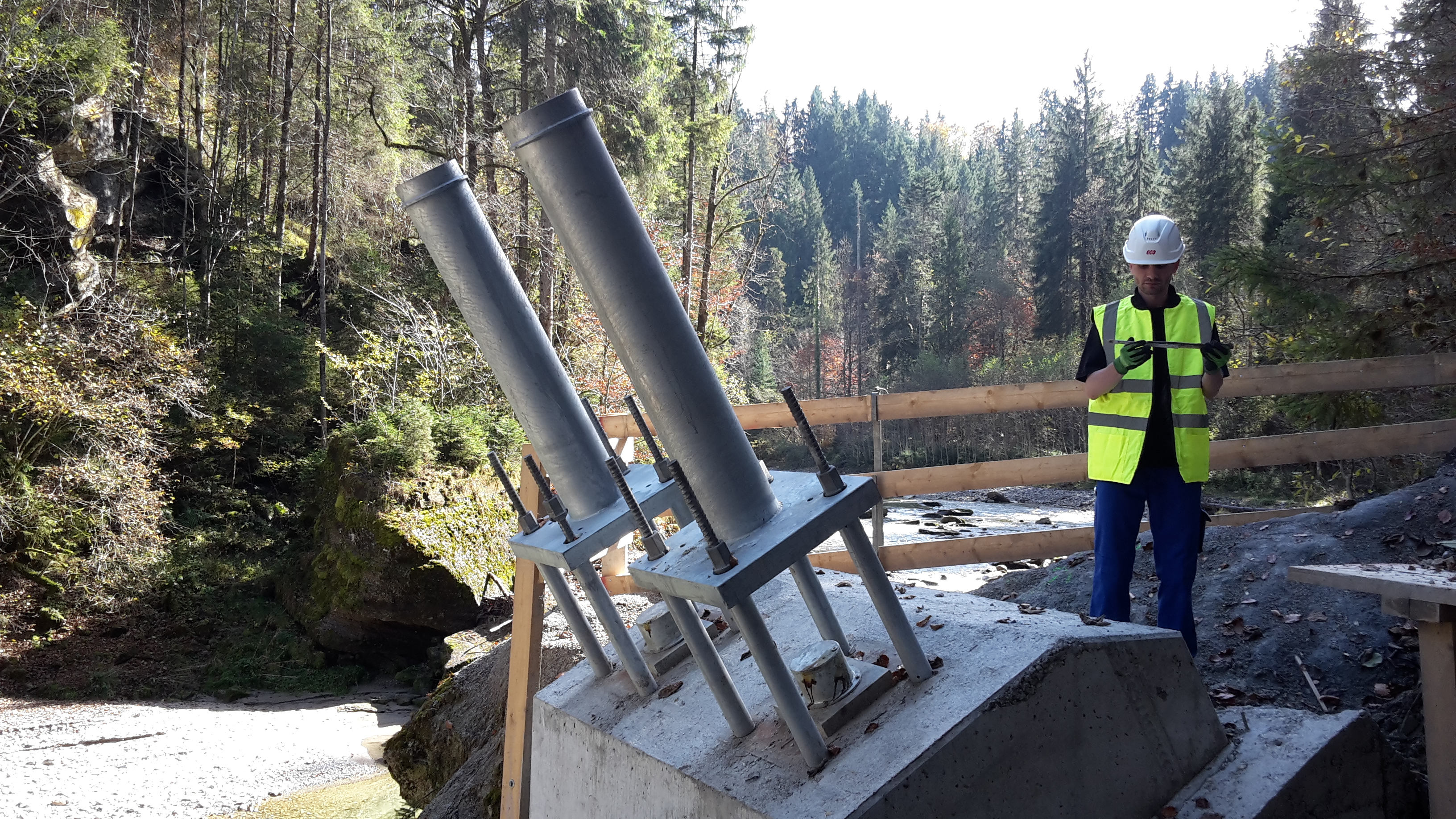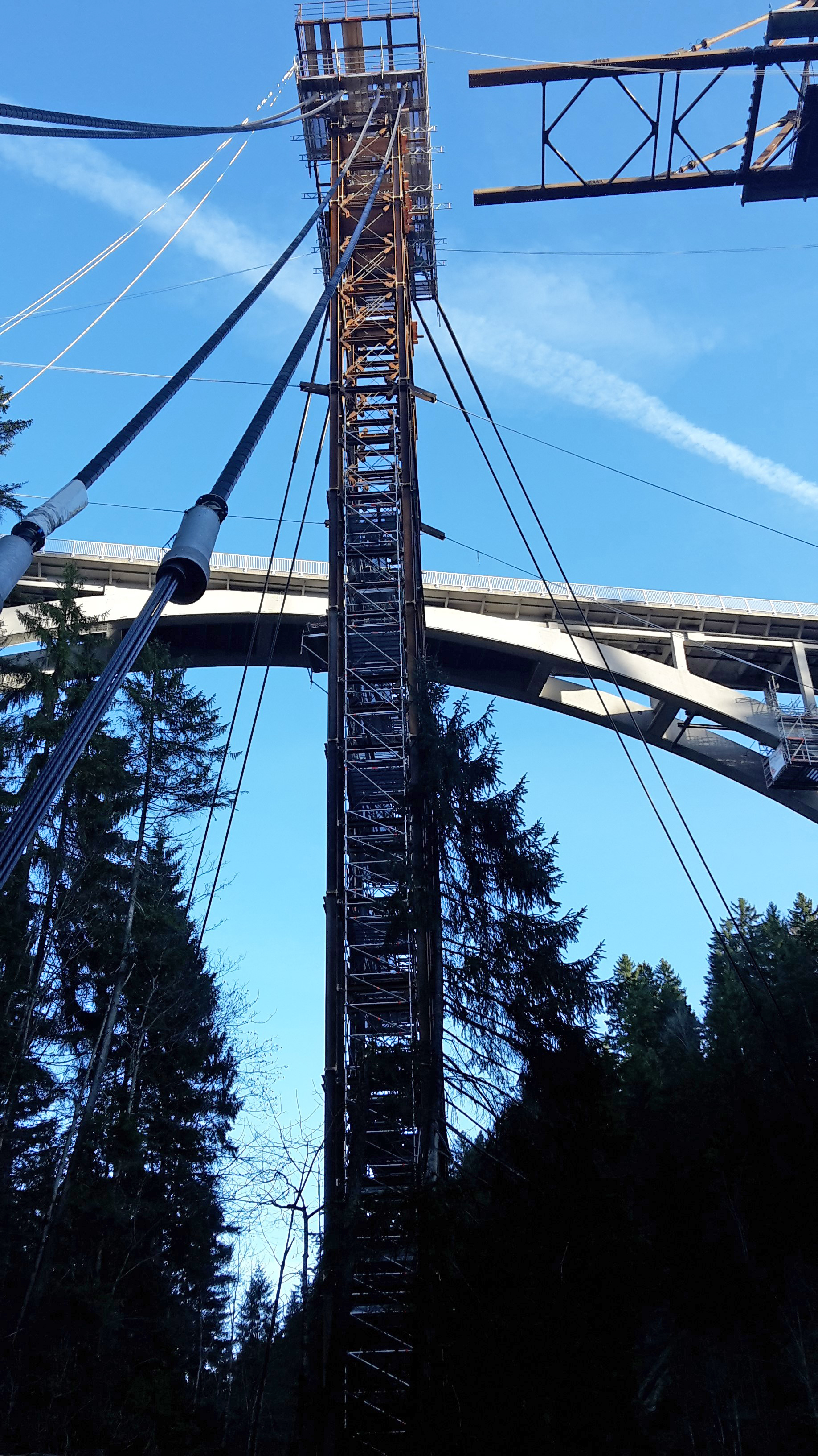 The temporary bridge consists of a modular construction system, weighs nearly 1,300t and is supported by 3 piers. The structure was assembled on site near Bad Bayersoien and was pushed across the gorge in 9 phases using hydraulic strand jacks.