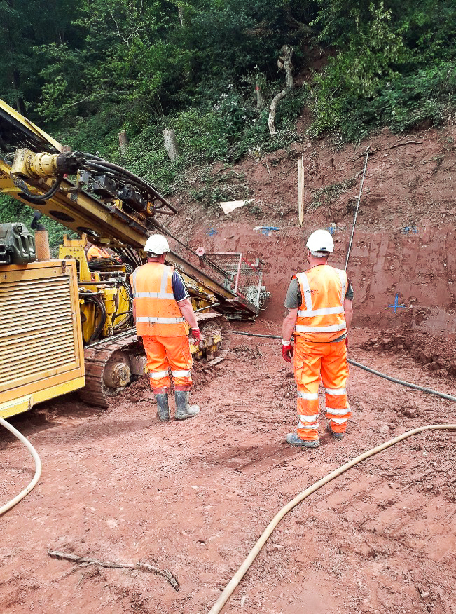 The DYWIDAG R32 76mm diameter arc-shaped button carbide drill bit EYY was specified to drill through the tough, dense gravels in order to reach a socket within the layers of mudstone further back into the embankment. This is typical geology for the banks of the Severn in this location.