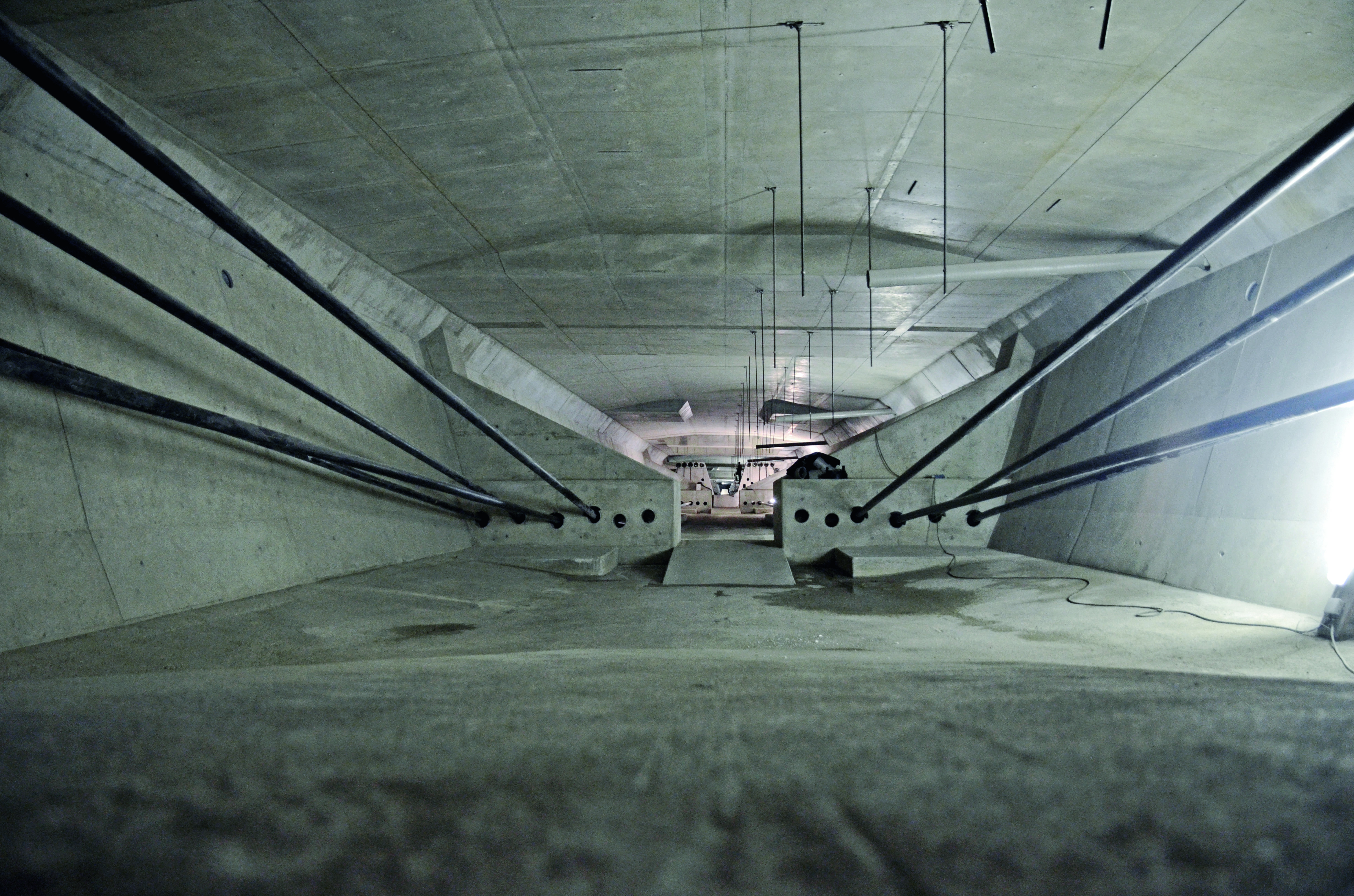 For stabilizing the superstructures during construction, centralized post-tensioning in the bonded areas was sufficient. The eccentrically placed tendons that will accommodate traffic loads were only installed after completion of the two superstructures.