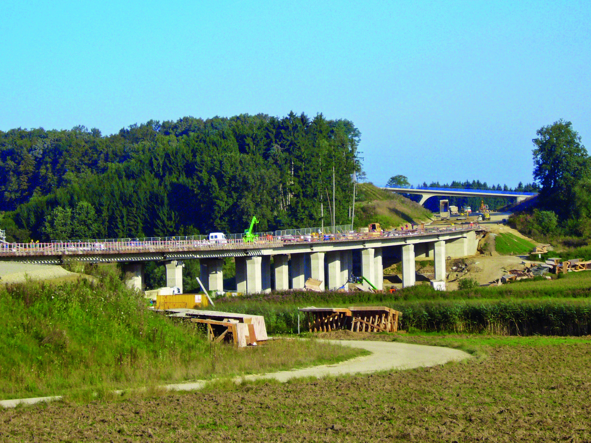 The bridge leading over the Kleine Laber consists of two separate double-webbed T-girders reaching a total length of 273m with eight 35m long internal spans and 31.5m long end spans. For the first time, internal unbonded tendons were used for post-tensioning a bridge that is erected in sections and incorporates overlapping tendons.
