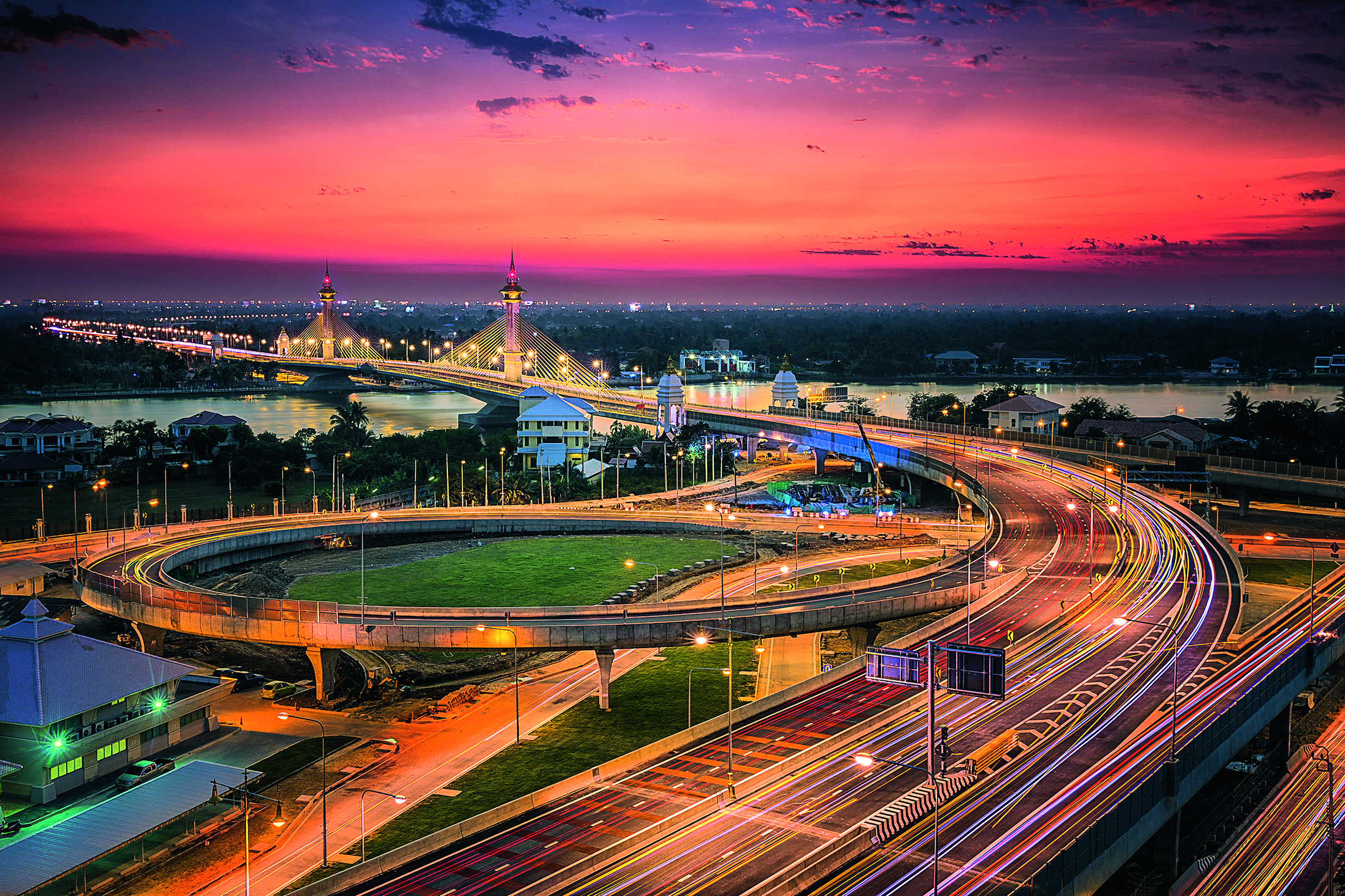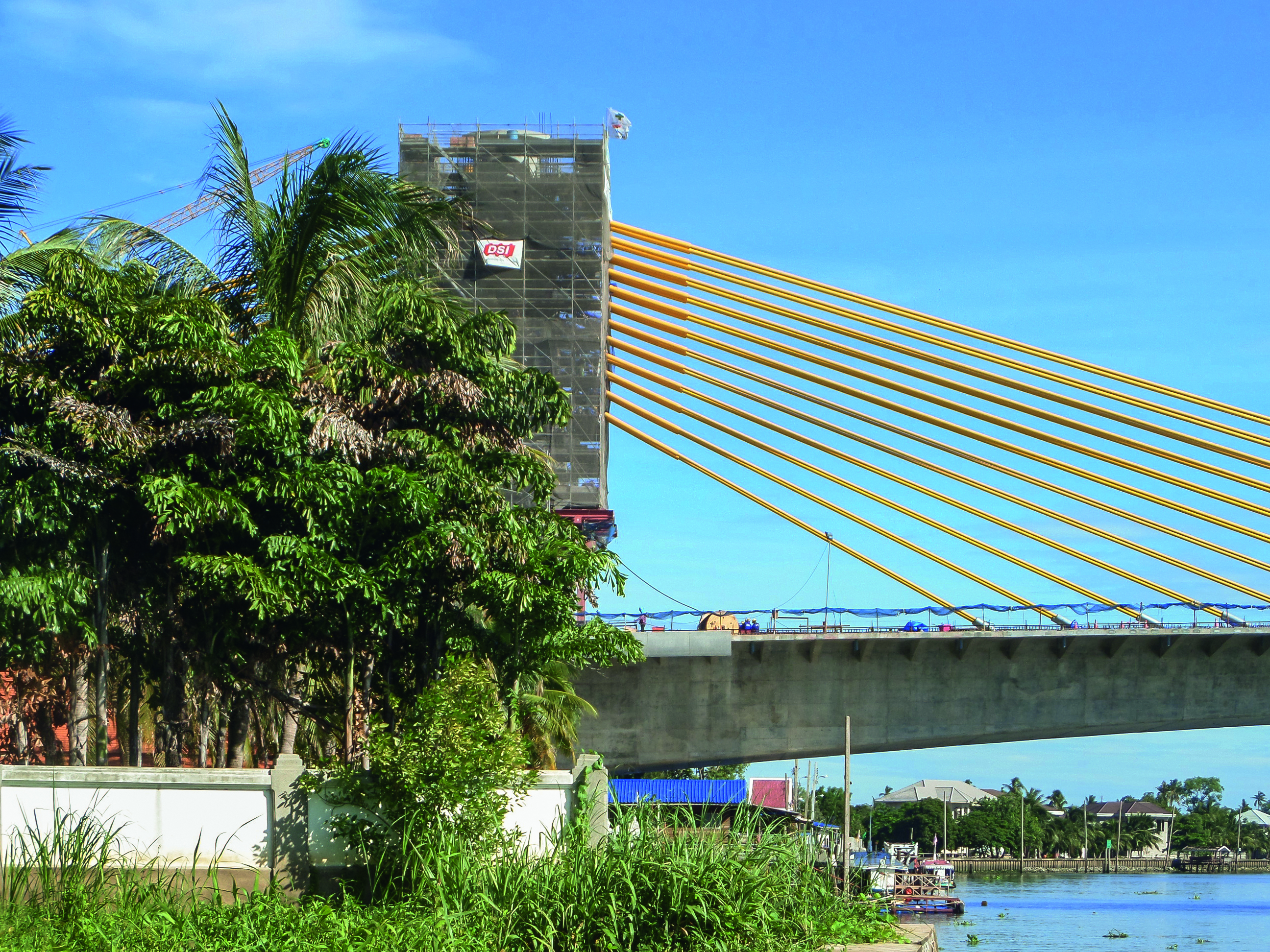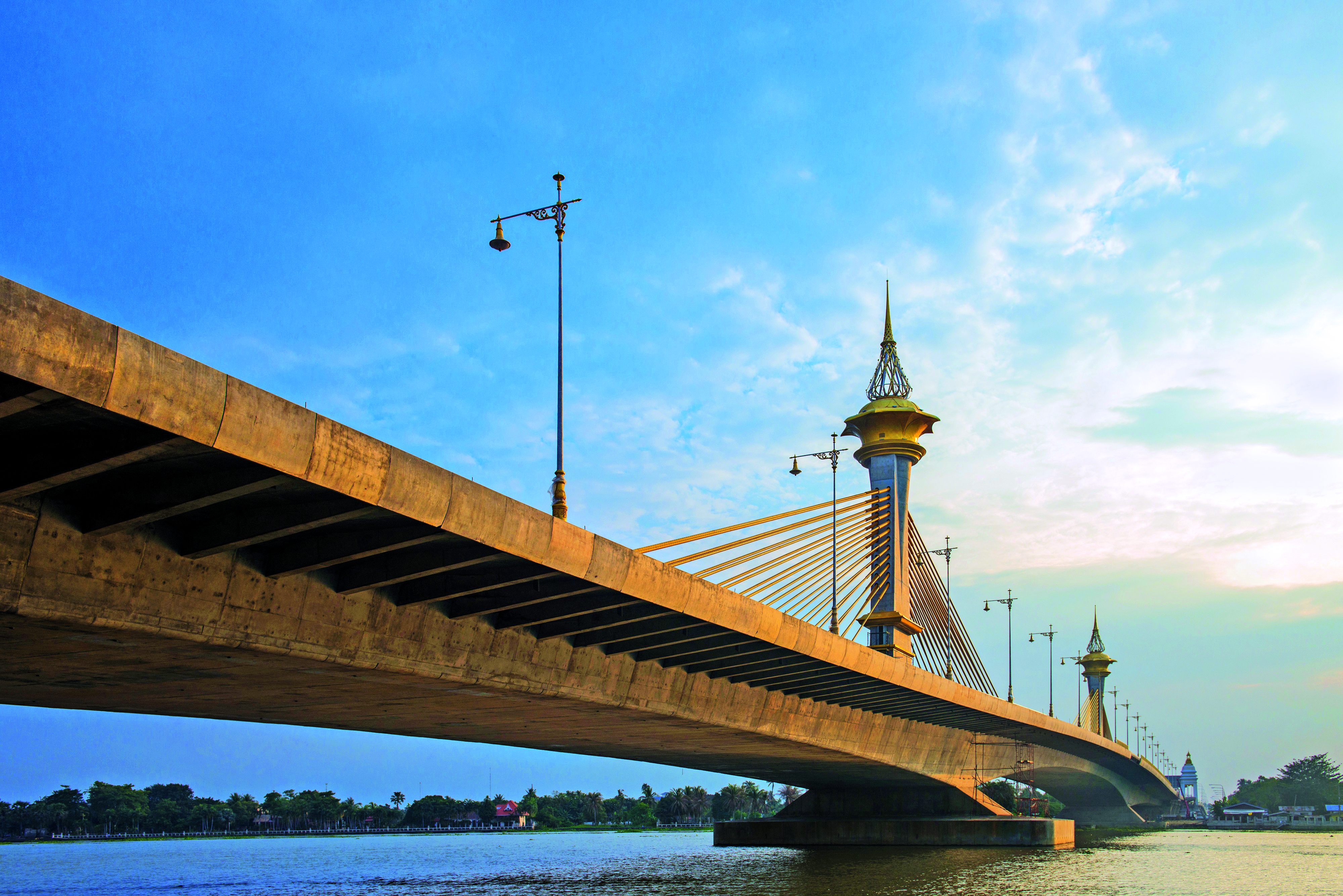 The Chao Phraya River Crossing Bridge is part of an infrastructure project in the Province of Nonthaburi 30km north of Bangkok. The 460m long two pylon bridge is Thailand’s widest bridge with a width of 32.4m, and also the first extradosed bridge in the country.
