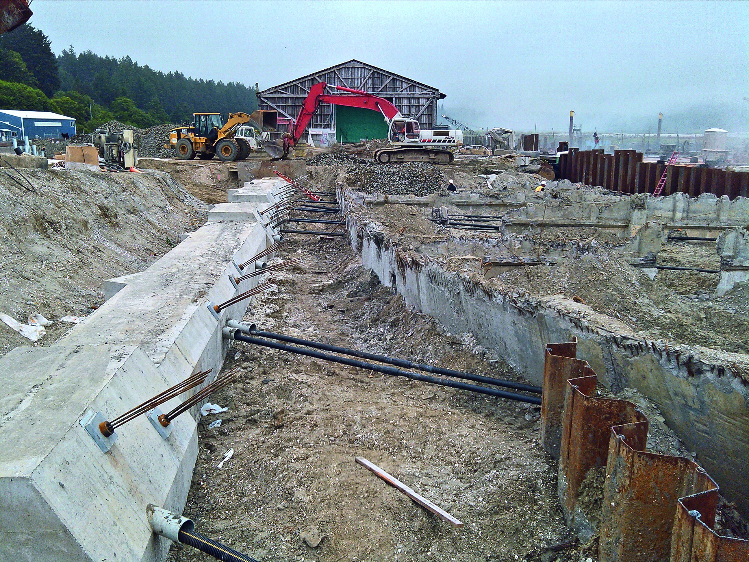 The installation of the tie rods presented a challenge because they had to be installed through holes in the existing concrete ships. In addition, some DYWIDAG Tie Rods extended through the sheet pile wall to a waler system that could only be accessed during low tide. After all the elements had been installed, the tie rods were tensioned to a nominal load using a hydraulic tensioning jack and locked off. Afterwards, the tieback anchor system was stressed to ensure that the sheet pile wall did not deflect during placement of the backfill.