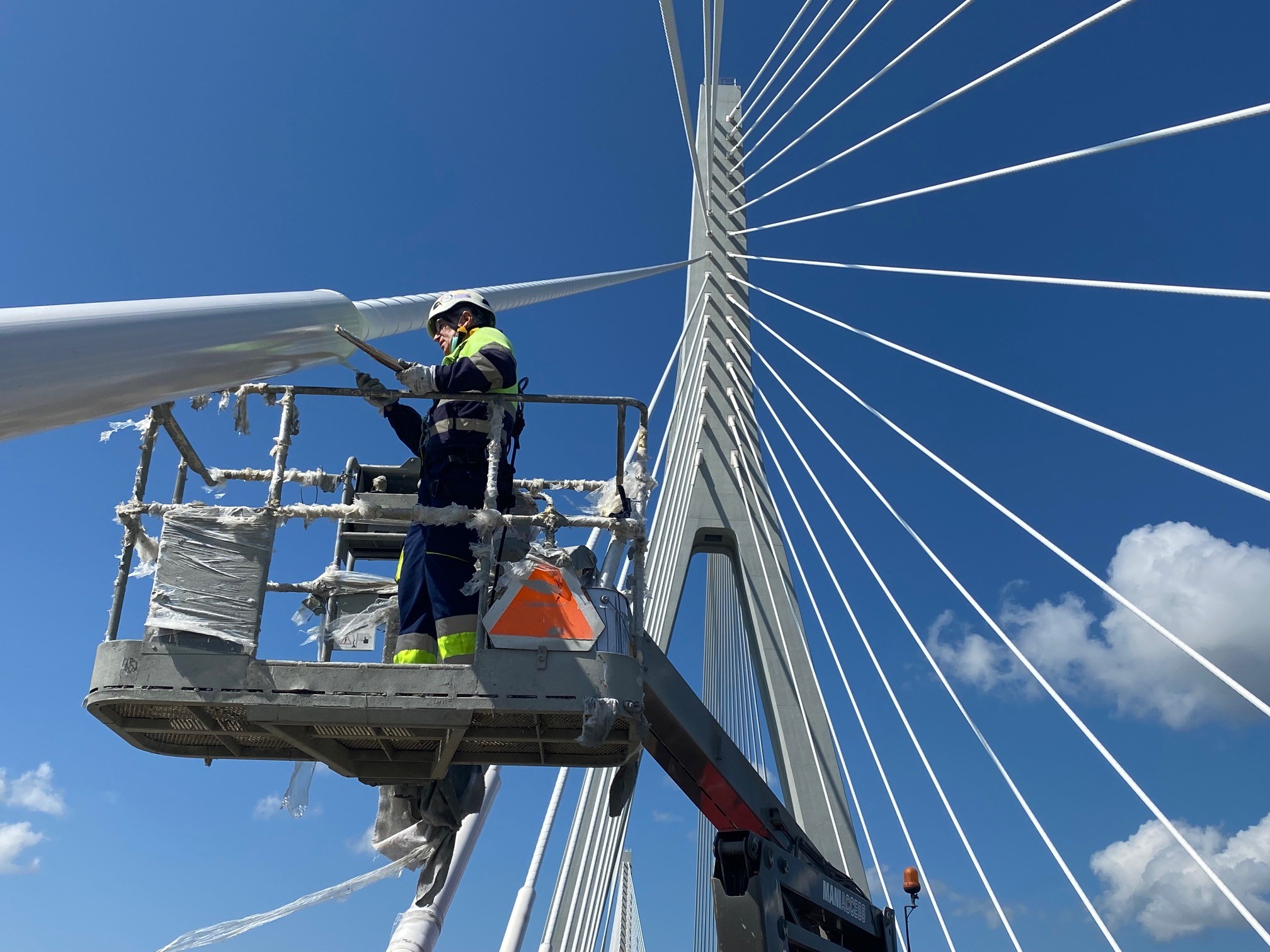 The Guadiana International Bridge is located 250km southeast of Lisbon on the border between Spain and Portugal. Following breakage of three strands in recent years, inspections and non-destructive testing indicated a full stay cable system replacement was needed.