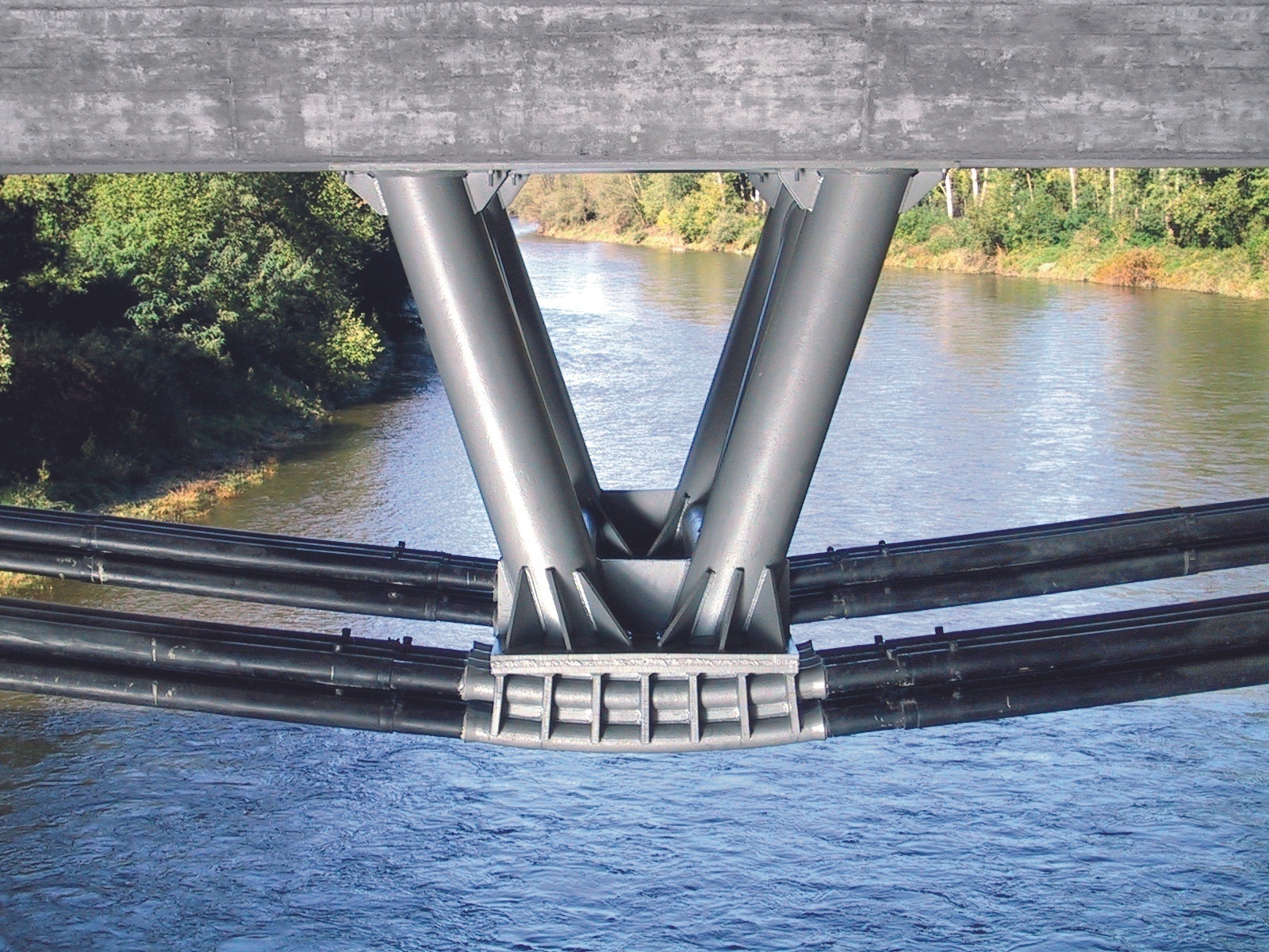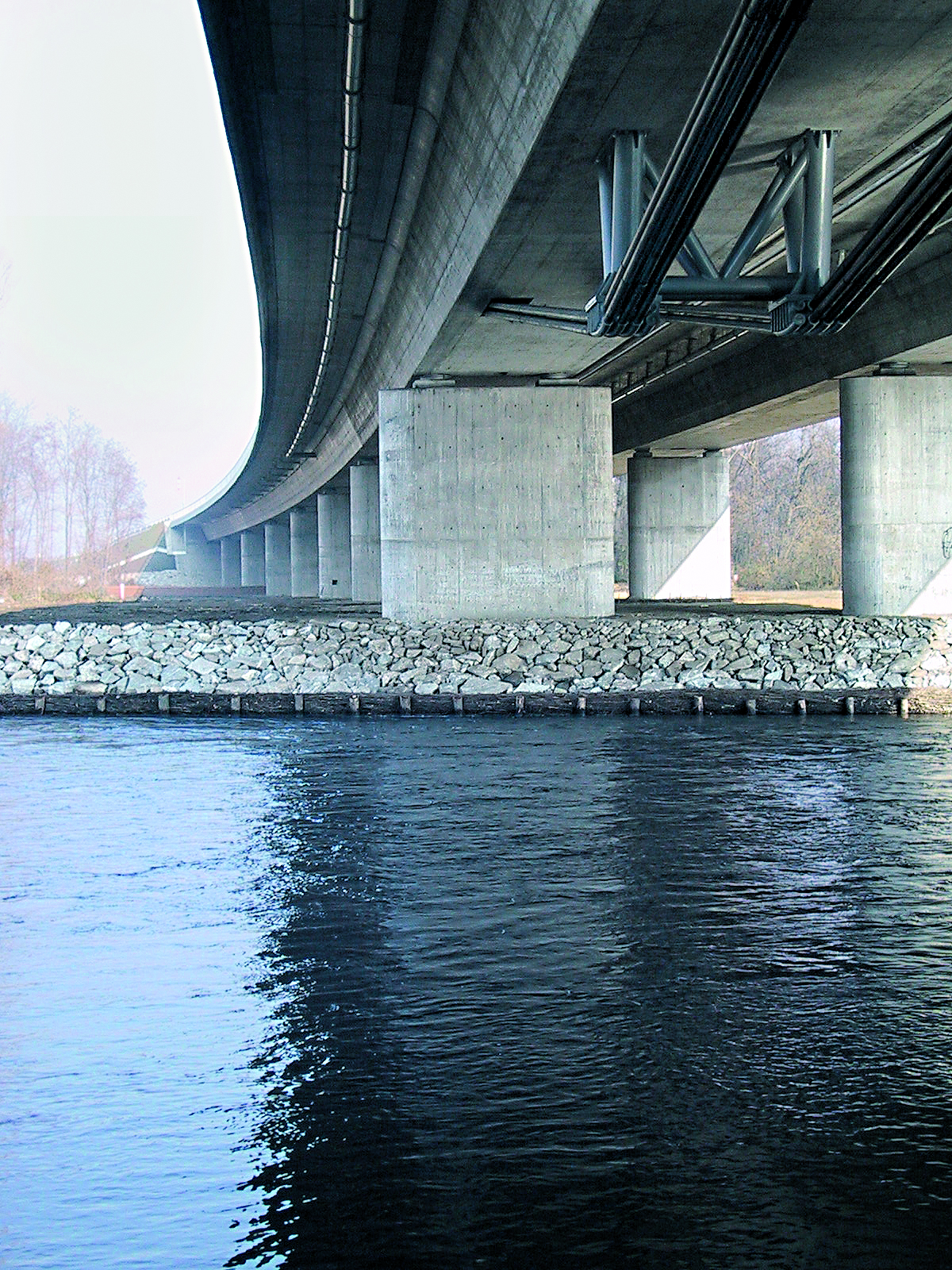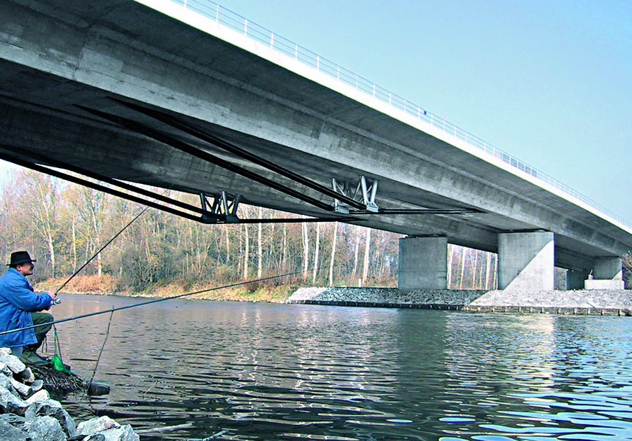 The bridge is built on a total of 38 piers with heights from 7.0m to 8.5m. All piers are exclusively located in the flood area and not in the river itself. The bridge architecture called for the use of various stressing methods: on the one hand, classic post-tensioning in the concrete cross section and, on the other hand, tensioning of external tendons in grouted HDPE pipes (type MC) and external monostrand tendons in HDPE pipes (type W).
