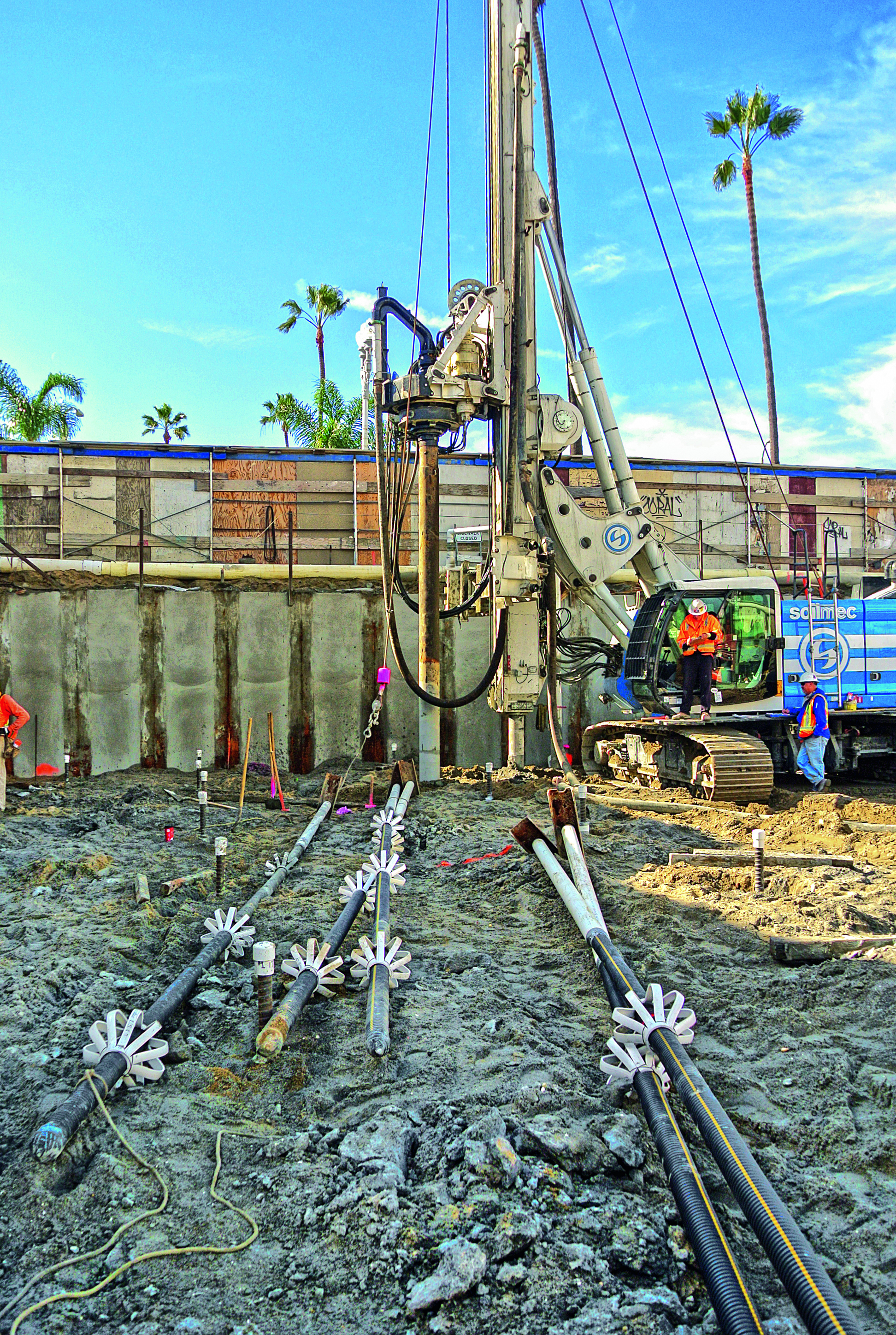 Since the job site is at the waterfront below sea level, the entire perimeter of the project is enclosed by a combination of sheet pile walls and secant pile walls with a series of de-watering sump pumps running continuously until the waterproofed concrete walls over the sheet piles are complete. The design engineer selected DYWIDAG Micropiles to resist the uplift force on the underwater concrete slab and to prevent structural damage due to high potential of soil liquefaction in the event of an earthquake. A total of 624 double corrosion protected (DCP) 57mm Ø DYWIDAG Micropiles were installed in a grid pattern at approx. 3.66m (12ft) spacing for this project.