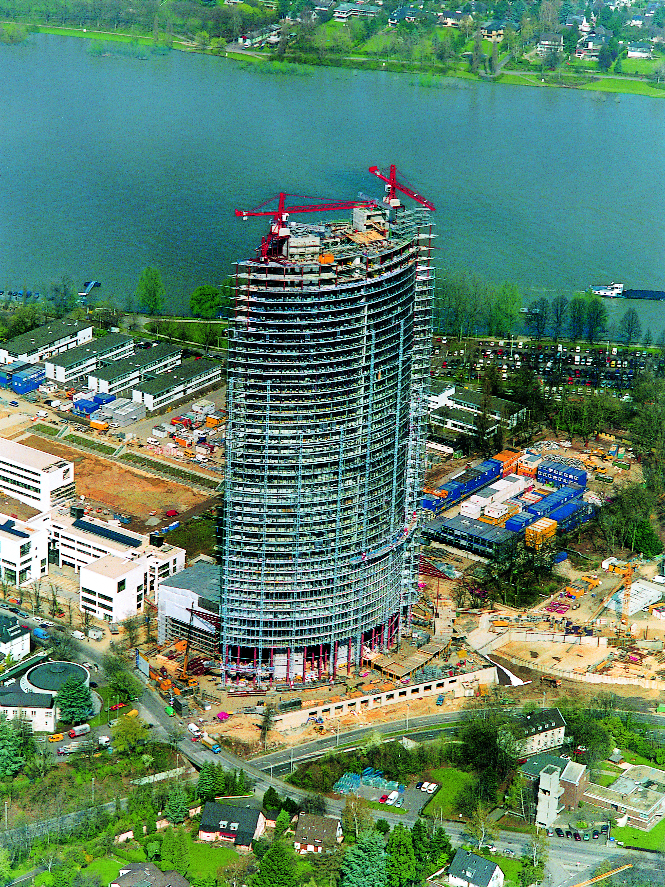 The shape of the Post-Tower is similar to two halves of an ellipse executed in a slightly staggered pattern. In between a so-called sky garden will be created every nine storeys. These "open air" levels divide the high-rise building into four sections providing an excellent view of the Rhine, the surrounding hills (the so-called Siebengebirge) and the city of Bonn. The building consists of a total of 40 upper floors and five underground floors with 600 parking spaces. A pedestal building with conference rooms and catering facilities was built adjacent to the high-rise building.