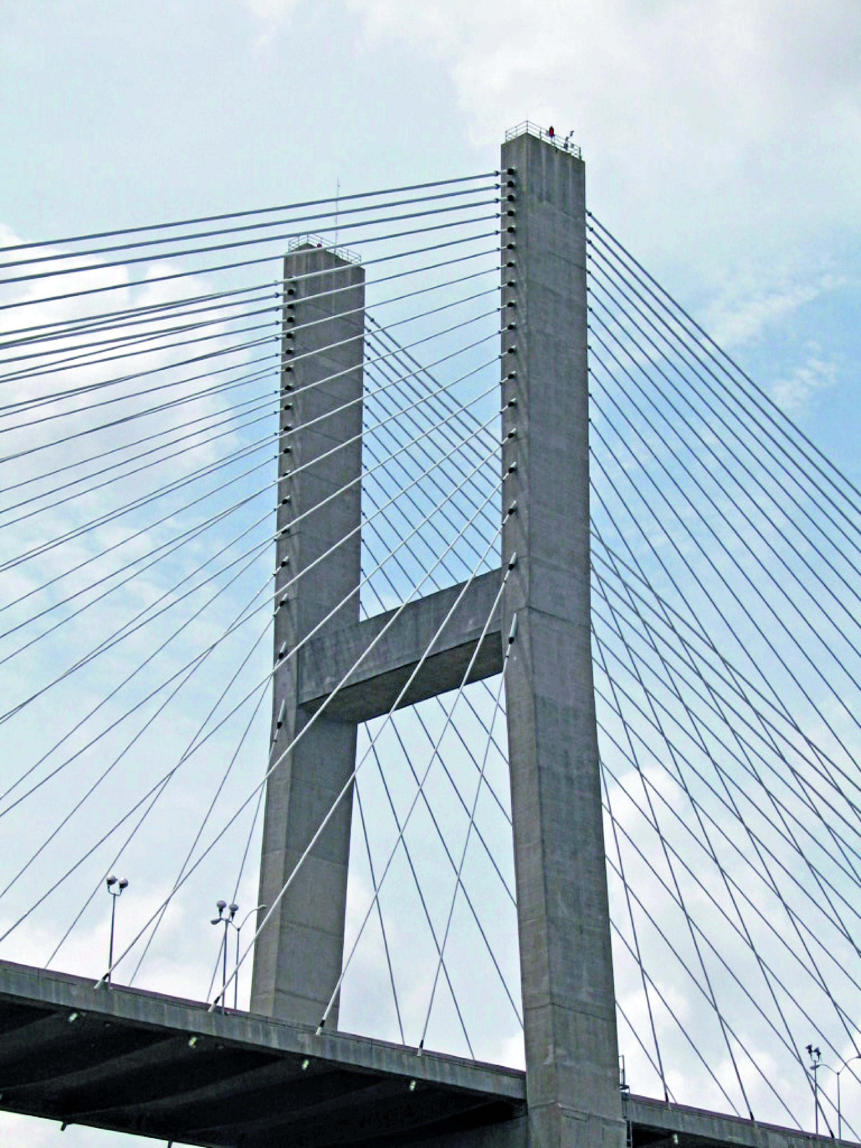 As is usually the case with cable-stayed bridges of similar design, urethane dampeners are at the base and top of each cable. They are located between the cable-stay duct and the exit pipe that is part of the deck or pylon, where the cable stay enters the exit pipe. With this system, dampeners suffer from the continuous vibration in the bridge cables over time and eventually come loose, thus failing to provide the necessary dampening.