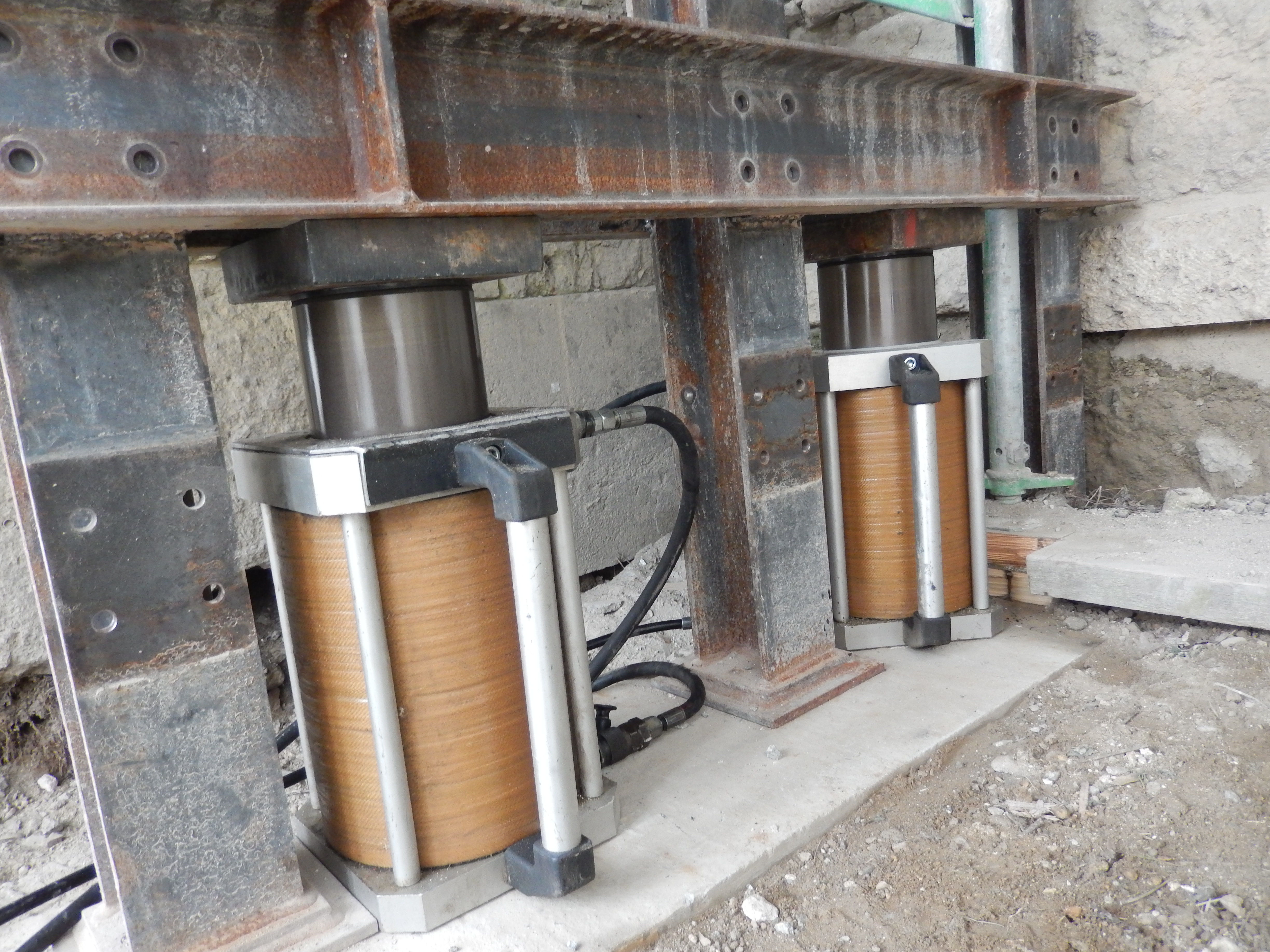 Due to the salt damages and core fractures, a fundamental repair of the pillars and girder axes is being carried out. One of the pillars in need of repair was temporarily replaced by a temporary steel structure. In order to take the load off the pillar, 4 CFRP Hydraulic Cylinders supplied by DYWIDAG were placed underneath the structure and slightly loaded so that the temporary steel support could accommodate the loads.