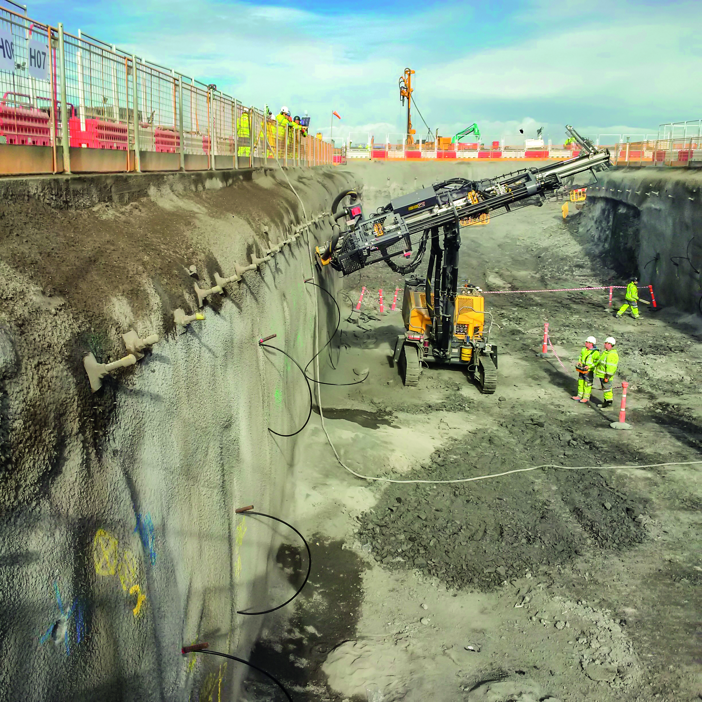 Any movement of the active wedge or face translates into a load increase in the soil nail, which is identified by the Monitoring Force Sensor. The long debonded section, up to 10.5m, ensures that any deep-seated fault movement can be picked up by the sensor. Some of the excavations are known to cross existing fault zones. As the excavations have deepened, stresses recorded by the Monitoring Force-Sensors in some of the DYWIDAG Gewi Soil Nails have increased significantly. The Monitoring Force measurements have provided the engineers with a high level of information on the impending movement at the face, enabling the areas of high stress to be remediated with additional bolts or anchors prior to the excavation continuing. In addition, in areas where heavy cranes are working at the top of the excavations, Monitoring Force Sensors provided additional safety by an accurate monitoring of load changes.