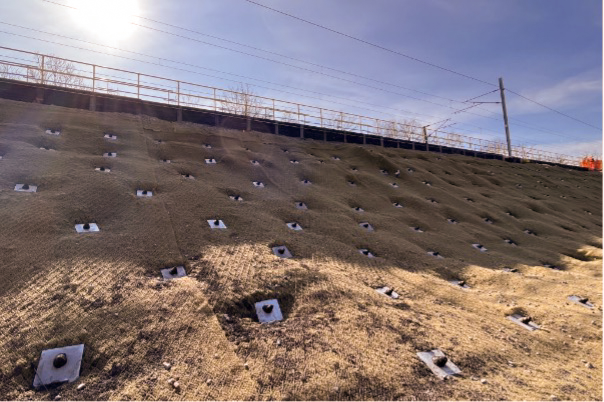 The design of the soil nail solution was based on slope stability analysis of the embankment undertaken at critical sections, and the fact there are predominantly Cohesive soils with underlying terraces of Sands & Gravels. Soil nail positioning and spacing varied along the site depending on the slope geometry and the TAM risk categorisation. The design specified that the slope face be finished with a flexible facing, spanning between nail locations to minimise long term degradation of the slope face. To verify the ultimate bond resistance of the soil nail and identify any issues with the method of construction, sacrificial soil nail tests were conducted at the site in advance of the main work.