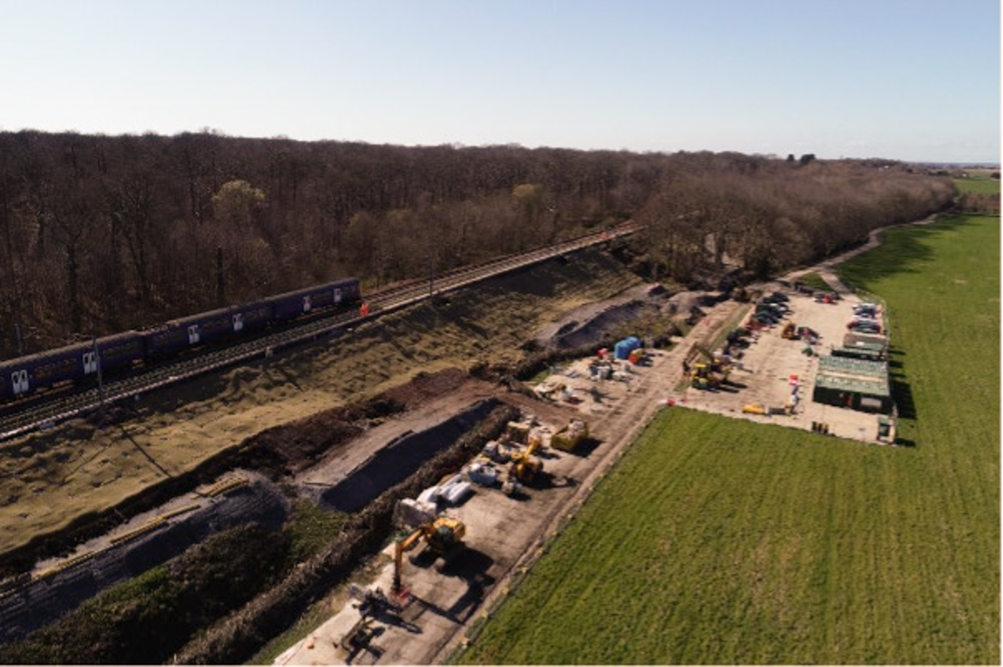 Construction at the Wrabness site started with the temporary works package in December 2021, and completion of the permanent works was in April 2022. To maintain operational Rail movements the work was undertaken from the embankment slope side. The principle contractor J. Murphy & Sons Ltd, planned and managed the construction works to minimise the impact on residents and to satisfy Natural England’s requirements for working adjacent to the Stour and Copperas Woods: a SSI. J. Murphy & Sons implemented a monitoring strategy during construction, which recorded movements of the track, embankment slope and lineside structures, such as overhead line equipment. The monitoring data was shared with the project team. Atkins Global undertook weekly reviews of the site monitoring data and to highlight areas for concern.