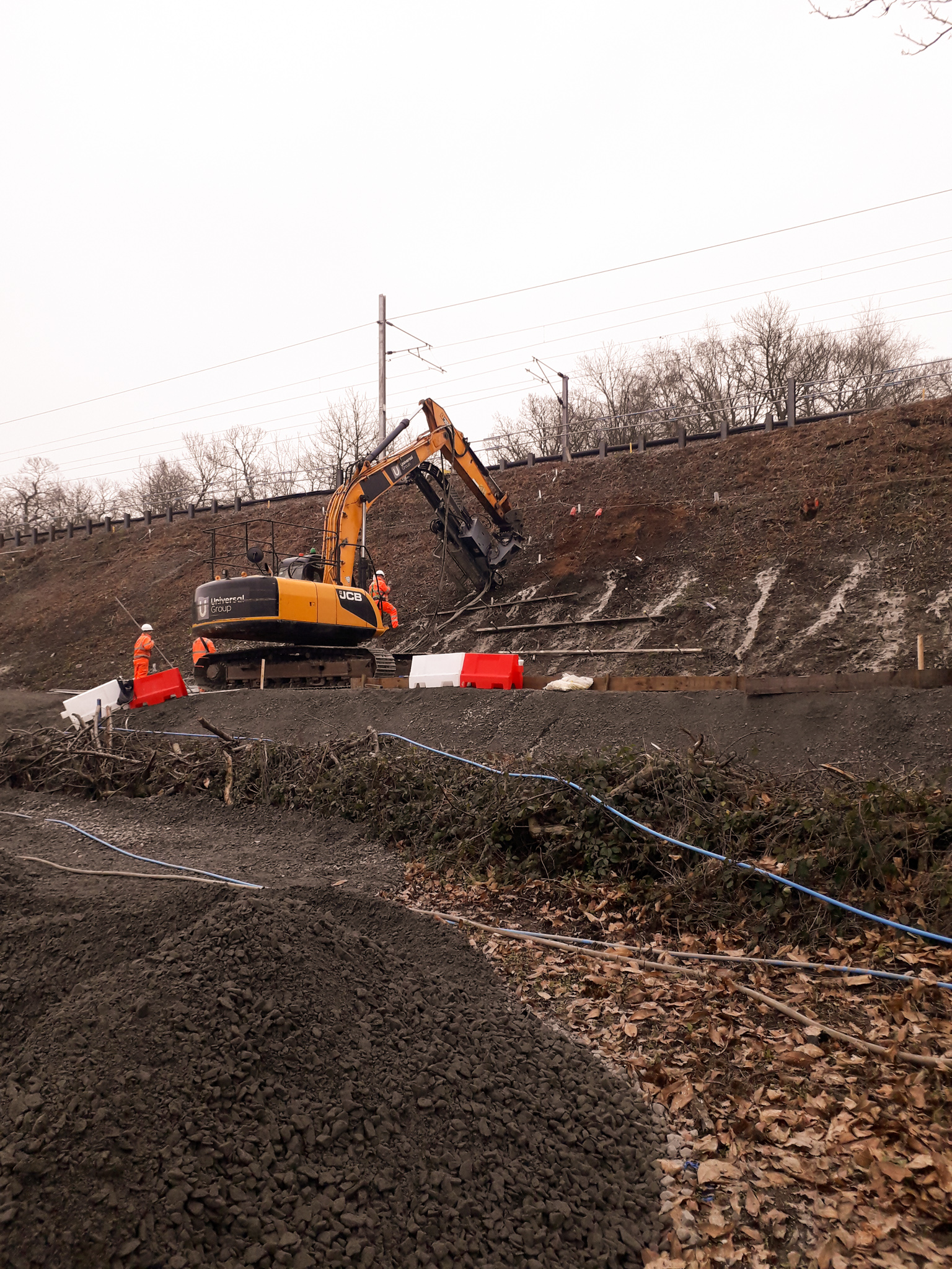1388no. soil nails and 16000 mtrs of hollow bar, with 11.5 mtr average nail length, were installed into the embankment toe, using Ripamonti Excavator Mounted Mast Drilling Rigs, 2no. standard reach units and 1no. long reach unit. All rigs were operated from a temporary working platform constructed towards the toe of the embankment.
