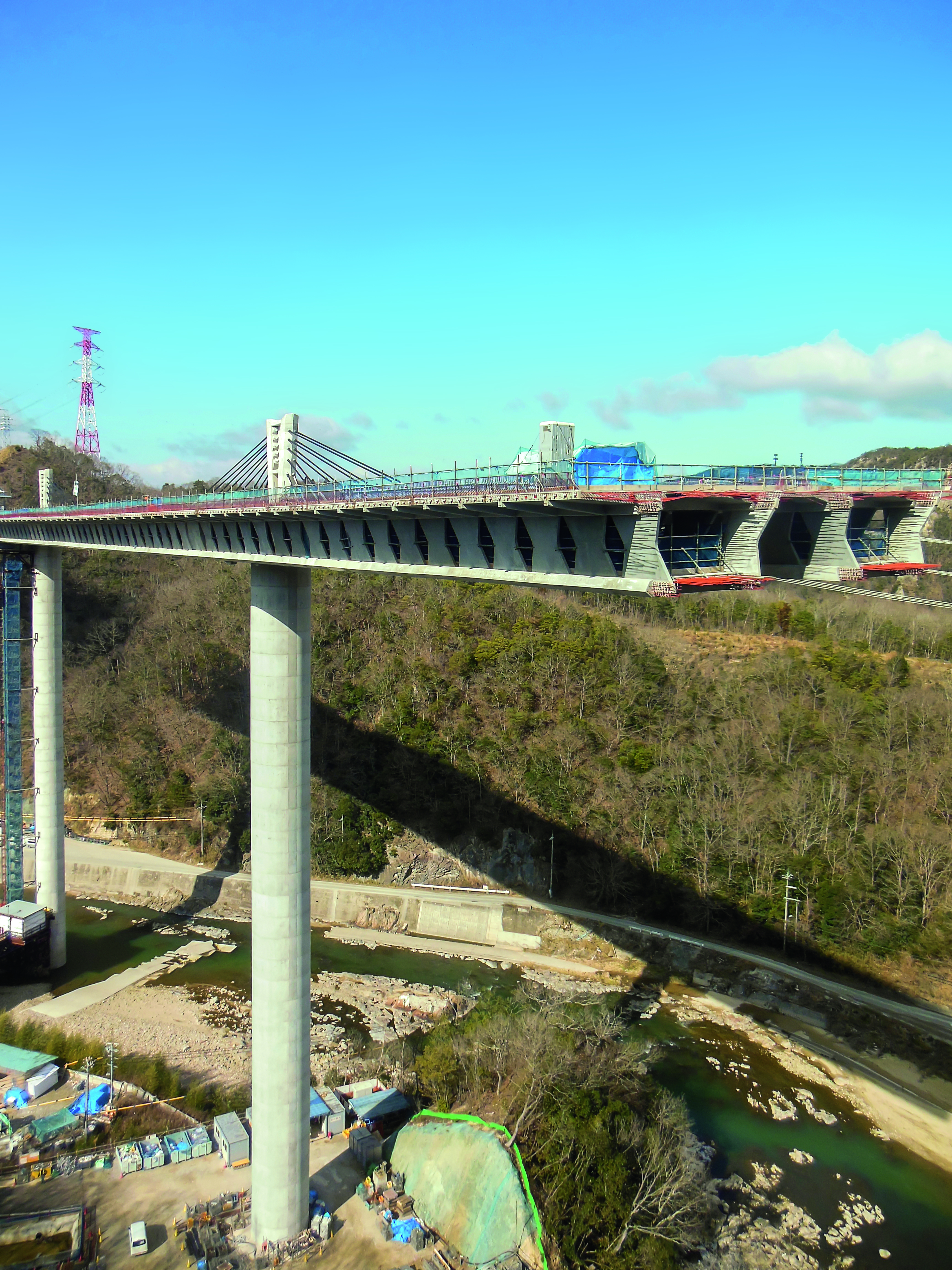 The 442m long extradosed bridge with a continuous rigid frame and butterfly webs includes three 100m long spans. The weight of the superstructure was reduced by butterfly shaped precast concrete panels that are installed at defined distances. Thanks to the reduced weight, the cross section of the piers was reduced to create a slender pier configuration.