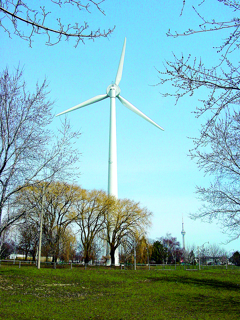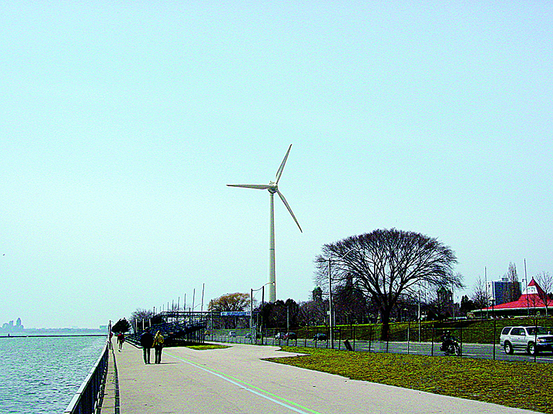The wind tower located near Band shell Park at the west end of the Canadian National Exhibition grounds, is 94-meter high, produces 750-kilowatt.